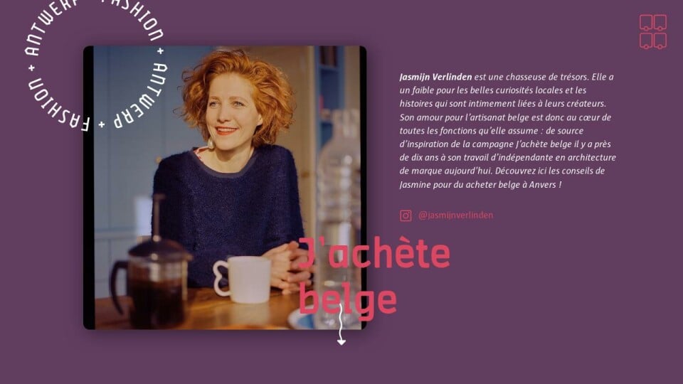 Jasmijn Verlinden est une chasseuse de trésors. Elle a un faible pour les belles curiosités locales et les histoires qui sont intimement liées à leurs créateurs. Son amour pour l’artisanat belge est donc au cœur de toutes les fonctions qu’elle assume : de source d’inspiration de la campagne J’achète belge il y a près de dix ans à son travail d’indépendante en architecture de marque aujourd’hui. Découvrez ici les conseils de Jasmine pour du acheter belge à Anvers !
